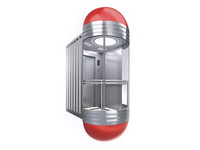 GR-GA03上下罩:镜面不锈钢压筋围坎,大红色亚克力装饰罩观光壁:180°圆形安全夹胶玻璃装饰顶:钢板烤漆顶板框架,中间乳白色亚克力灯饰轿壁:发纹不锈钢轿门:发纹不锈钢扶手:不锈钢双管地板:PVC(GR-B01)